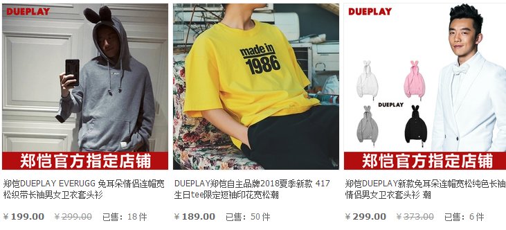 郑恺14年就开启了淘宝店,卖起了潮牌男女装,目前已经3皇冠了,恺恺也是经常微博宣传,而且还经常做网店模特参与拍照上新,经营非常的用心,郑恺自创品牌: DUEPLAY。非常专业,郑凯的这家店铺卖的商品种类很多,有上衣、下装、女装配饰、周二上新和合作产品。大家可以有很多的选择机会。