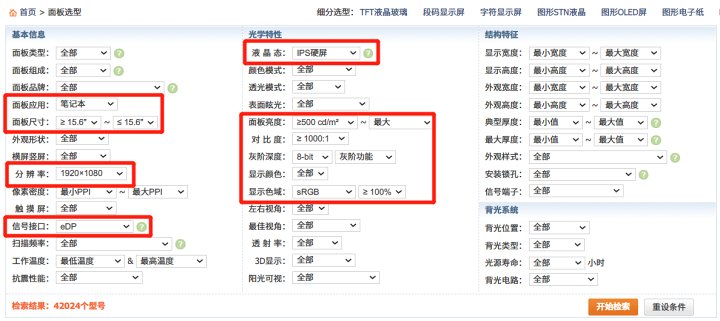 在“面板选型”中按照自己的需求以及原屏数据进行筛选,我们就可以慢慢筛选结果,决定购买型号了。