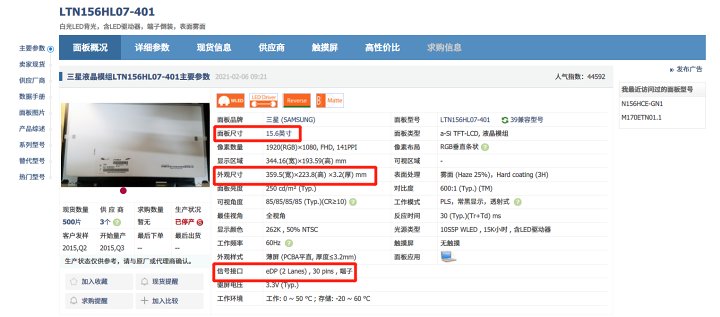 最终,我选择这款N156HCE-GN1,纸面参数是100%sRGB色域,8bit深度,支持HDR400,对比度1000:1,面板亮度500尼特,算是30pin笔记本屏幕里不错的数据了。可能是受限于接口针数,30pin中很难看到高分辨率的面板,如果是40pin接口的话,可以选择的范围还会高许多。