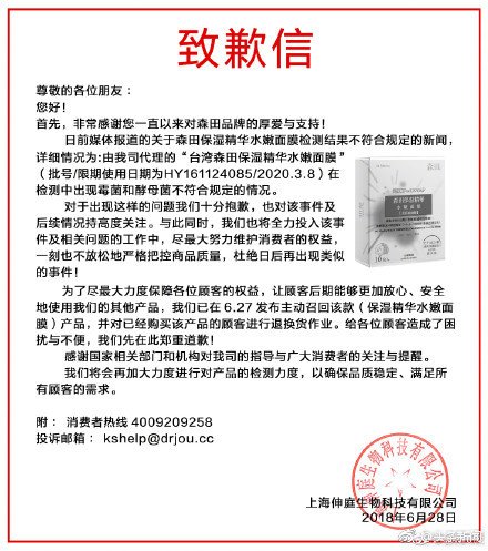 今日森田已经发布道歉信召回森田保湿精华水嫩面膜