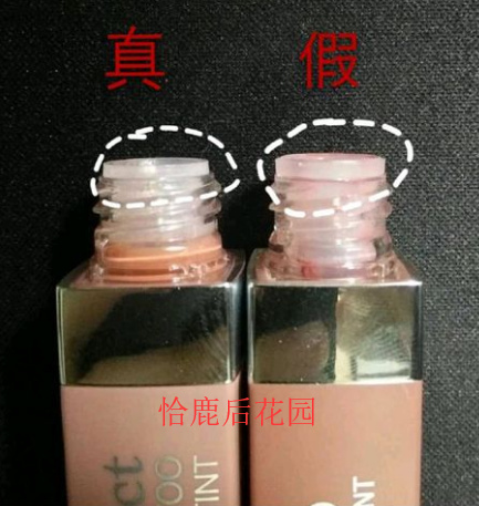 左真右假 唇釉底部标签贴的歪七八扭,底部印刷字体比较模糊,最重要的是正品左上角有压印 批号,这个是最重要的,假货没有压印批号、。