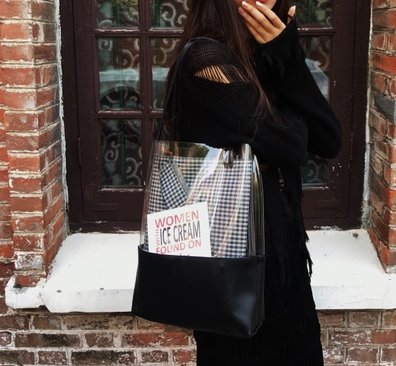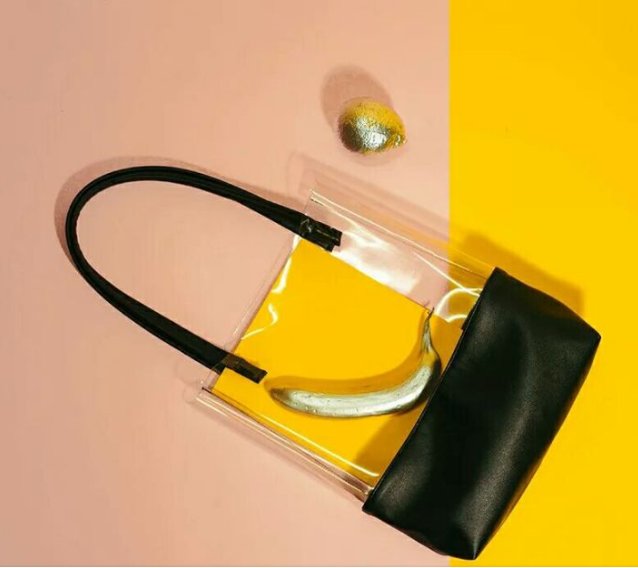 今天小编推荐的并不是什么大牌子透明包包,而是一个非常小众的品牌,小到没人听过,超平价格,牛皮和PVC透明拼接型托特包,某宝好评最好的。广州某艺术生自己原创设计的包。